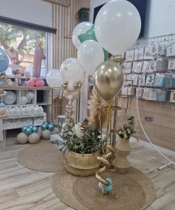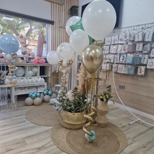 Decorada con globos de pie a juego en tonos beige, blanco y dorado