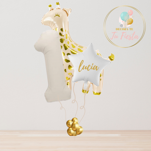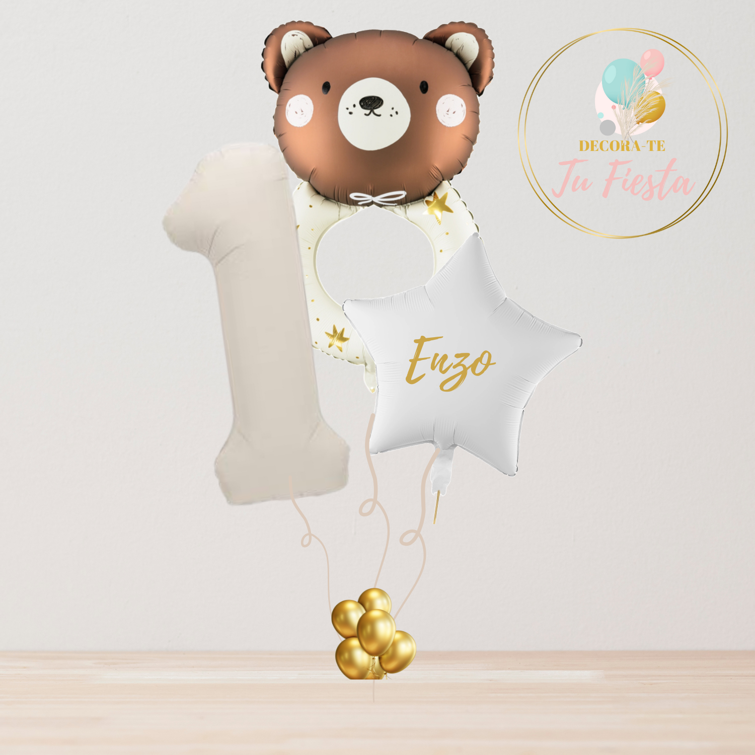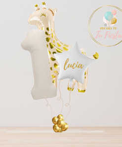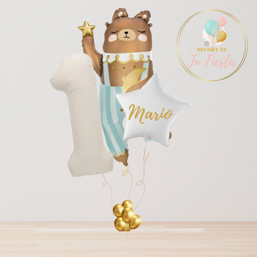 Incluye un globo número grande, un globo estrella con el nombre personalizado y un divertido globo de oso que dará el toque más dulce a la decoración.