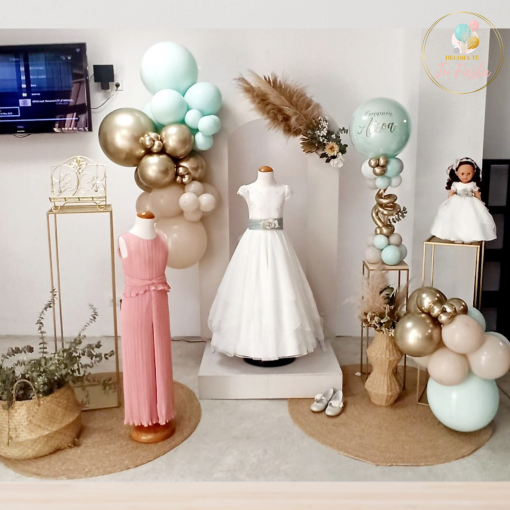 Transforma el momento especial de la puesta de traje en una experiencia inolvidable con nuestra elegante y cuidada decoración para comuniones. Este montaje ha sido diseñado para realzar la importancia del evento, creando un espacio visualmente armonioso, delicado y lleno de detalles.